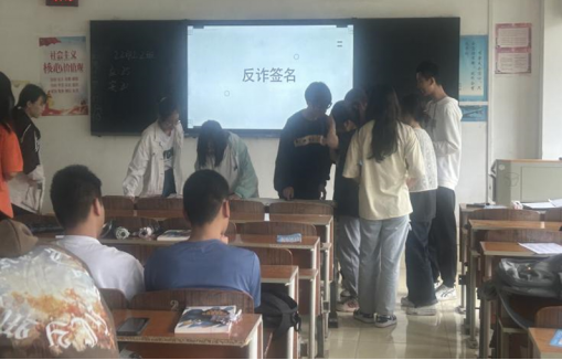 全员参与反诈宣传。组织辅导员老师认真学习常见诈骗方式及应对电信网络诈骗方法,才能更好的开好反诈宣传班会。会后要求学生撰写反诈心得,现场抽查学生反诈app是否正常运行,设立反诈通讯员以此来监督同学们的反诈情况。并且通过发放《反诈防骗承诺书》和防诈骗手写签名,引导学生树立树立正确的观念,鼓励每位学生积极回宿舍宣传,切实提高防电信诈骗的知晓率和普及率。此外,要求每位任课教师也要担负起反诈宣传的重任,在课堂教学中适时加入了防范电信诈骗的相关知识,让学生在潜移默化中提高了反诈意识。